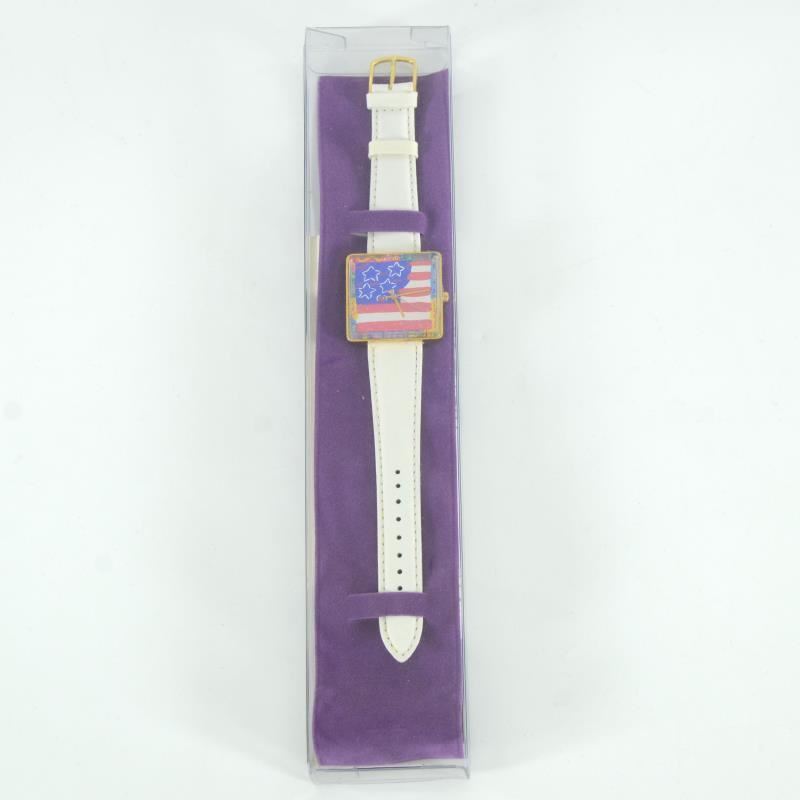 This is a vintage Peter Max "American Flag" wrist watch created for the Japanese market in 1991. This watch comes in the original packaging and with paperwork. Due to the age of the watch the battery will need to be replaced. A replacement battery will be included in this auction complementary. Measures approx. 1.5" x 1.5" (watch face).