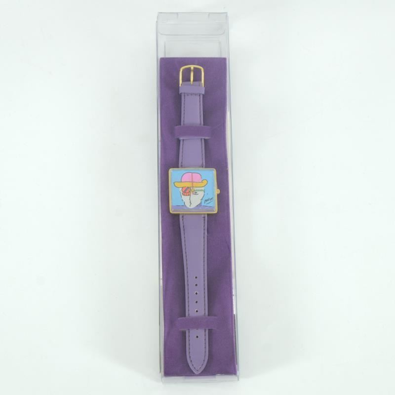 This is a vintage Peter Max "Face" wrist watch created for the Japanese market in 1991. This watch comes in the original packaging and with paperwork. Due to the age of the watch the battery will need to be replaced. A replacement battery will be included in this auction complementary. Measures approx. 1.5" x 1.5" (watch face).