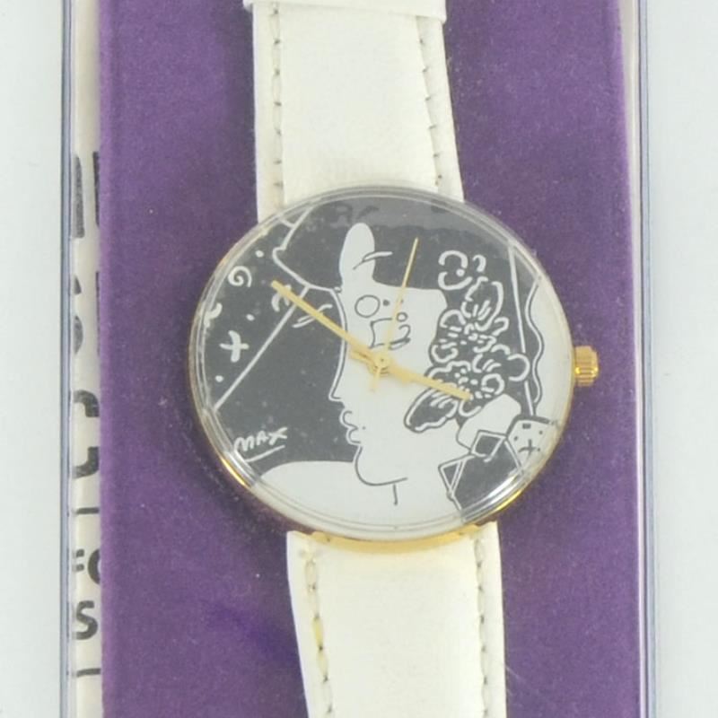 This is a vintage Peter Max "Profile" wrist watch created for the Japanese market in 1991. This watch comes in the original packaging and with paperwork. Due to the age of the watch the battery will need to be replaced. A replacement battery will be included in this auction complementary. Measures approx. 1.5" x 1.5" (watch face).