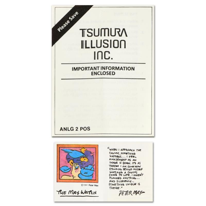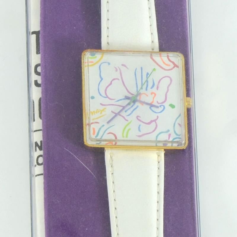 This is a vintage Peter Max wrist watch created for the Japanese market in 1991. This watch comes in the original packaging and with paperwork. Due to the age of the watch the battery will need to be replaced. Measures approx. 1.5" x 1.5" (watch face).