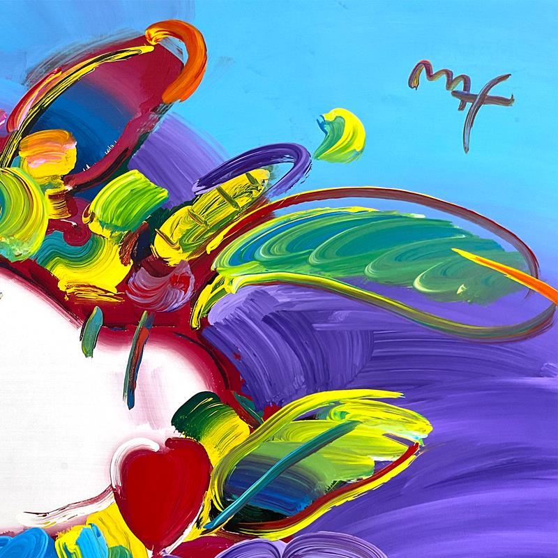 "Women in Love" is a one-of-a-kind acrylic mixed media on paper, hand signed by Peter Max. On the reverse side of this piece there is a registration number from Peter Max Studios certifying authenticity. This piece comes custom framed. Measures approx. 36.5" x 48.5" (frame), 24" x 36" (image).