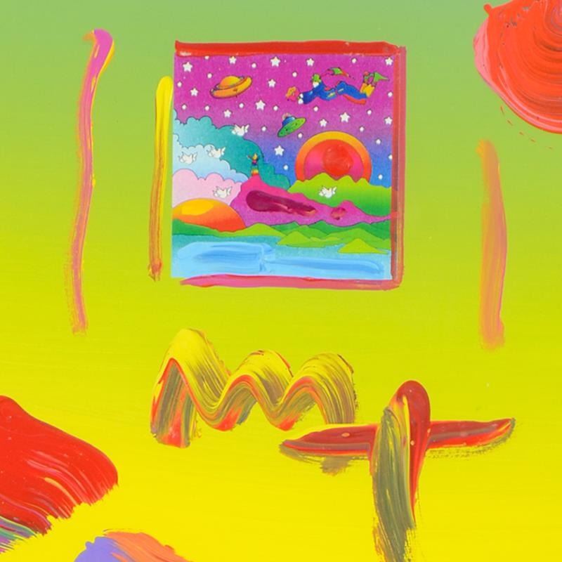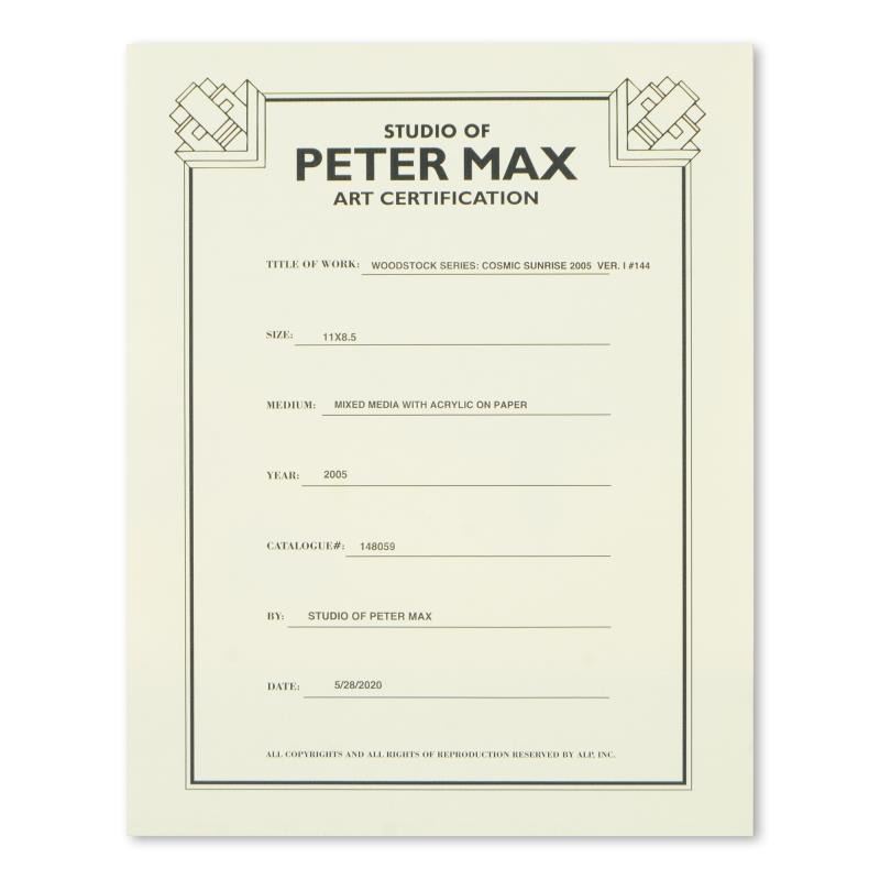 "Woodstock Series: Cosmic Sunrise" is a one-of-a-kind acrylic mixed media on paper, hand signed by Peter Max. This piece comes custom framed. Includes Certificate of Authenticity from Peter Max Studios. Measures approx. 19" x 21.5" (with frame), 8.5" x 11" (image).