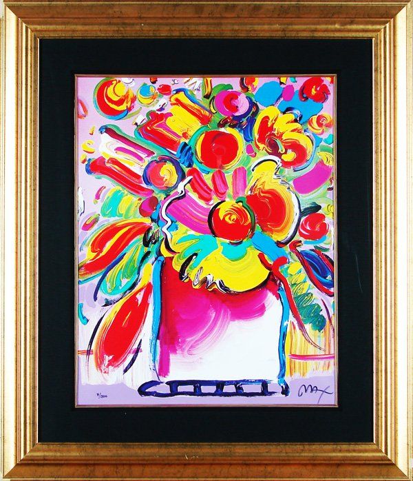 ABSTRACT FLOWERS II, color screenprint over color print, signed in marker, from the numbered edition 500, sight 27 x 21”, Peter Max stamp lower left , framed, may have slight arching of paper, otherwise in good condition.