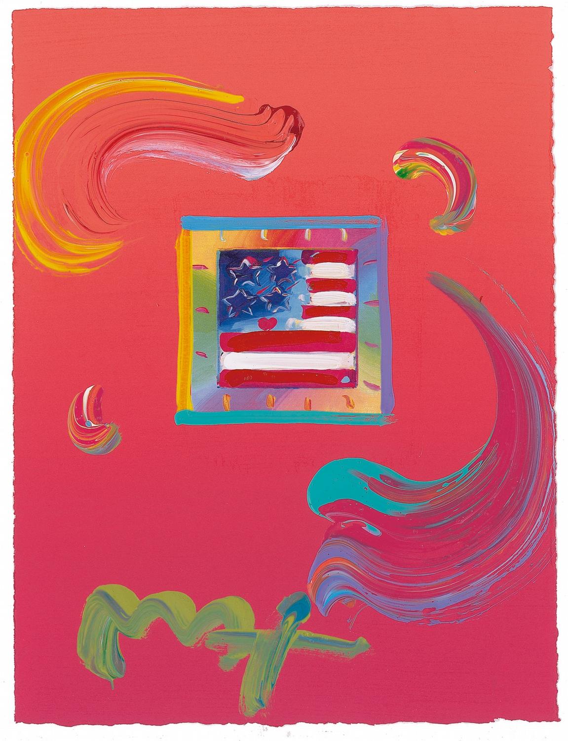 Vibrantly colored original artwork, entield ‘Flag with Heart,’ mixed media on an 8.5 x 11 sunburst sheet. Max has highlighted a 3.25 x 3.25 printed color image of ‘Flag with Heart,’ which Max has embellished with thick and colorful brushstrokes to both the image and surrounding areas, and signed in mixed color paint “Max.” Printed on the reverse is the following statement: “This Peter Max work entitled ‘Flag with Heart’ is a variation color combination (and brush strokes) from his original artworks of the same title on paper,” and also bears a 2010 Peter Max copyright stamp. In fine condition. Accompanied by a Peter Max original art certification. A unique and exciting design boldly highlighted by thick and colorful brushstrokes.