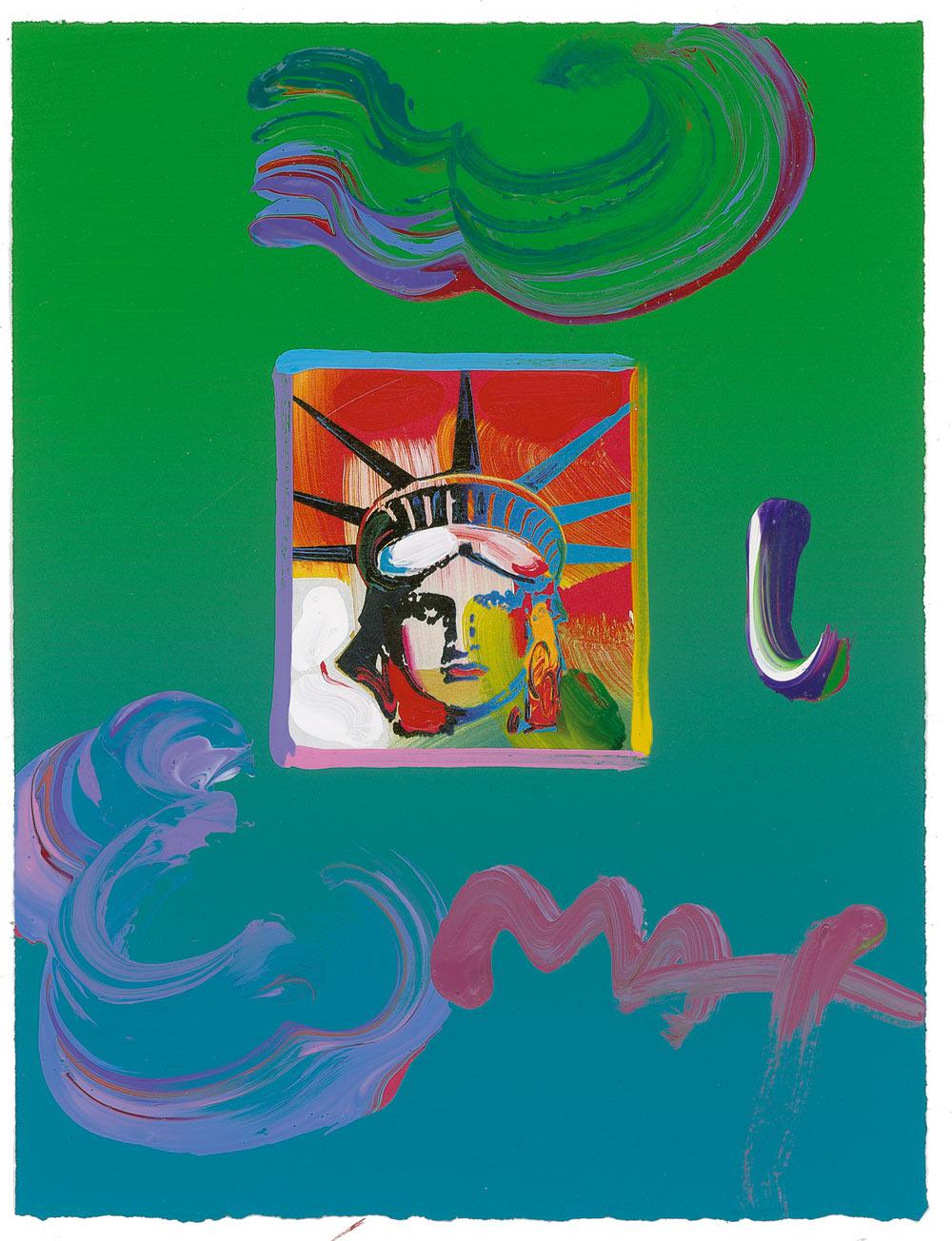 Vibrantly colored original artwork, entitled ‘Liberty Head,’ mixed media on an 8.5 x 11 sunburst sheet. Max has highlighted a 3.25 x 3.25 printed color image of ‘Liberty Head,’ which Max has embellished with thick and colorful brushstrokes to both the image and surrounding areas, and signed in mixed color paint “Max.” Printed on the reverse is the following statement: “This Peter Max work entitled ‘Liberty Head is a variation color combination (and brush strokes) from his original artworks of the same title on paper,” and also bears a 2010 Peter Max copyright stamp. In fine condition. Accompanied by a Peter Max original art certification. A unique and exciting design boldly highlighted by thick and colorful brushstrokes.