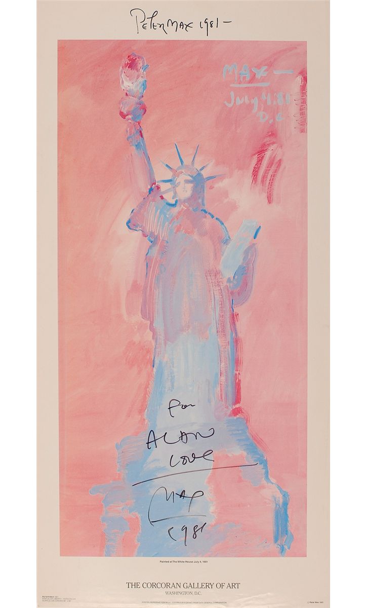 Color 12.5 x 25.5 poster entitled ‘Statue of Liberty Version Six’, signed at the bottom of the image in black felt tip, “For Alan, love Max, 1981.” Facsimile signature in the upper border. In fine condition, with a some light scattered creases and impressions, and a touch of soiling to the borders.`