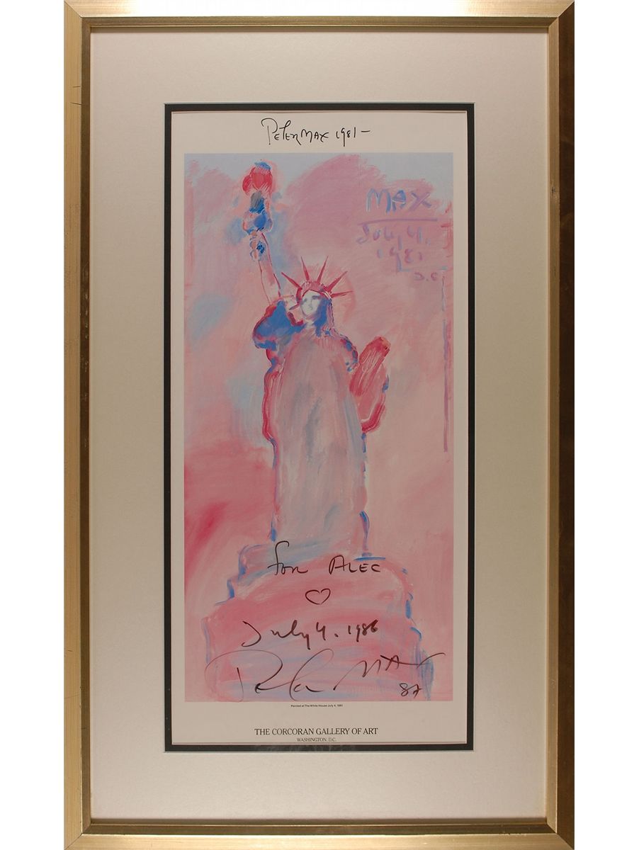 Impressive color 11.5 x 24.5 print of the Statue of Liberty from the Corcoran Gallery of Art, signed and inscribed in black felt tip, “For Alec, July 4, 1986, Peter Max, 87,” along with a small sketch of a heart. Print also bears a pre-printed signature to the upper border. Double-matted and framed to an overall size of 20 x 33.5. In fine condition. Collector’s notation to reverse of frame states that it was received directly from the artist in 1987. An uncommon and desirable full signature from Max, who typically signs with just his last name. Oversized.
