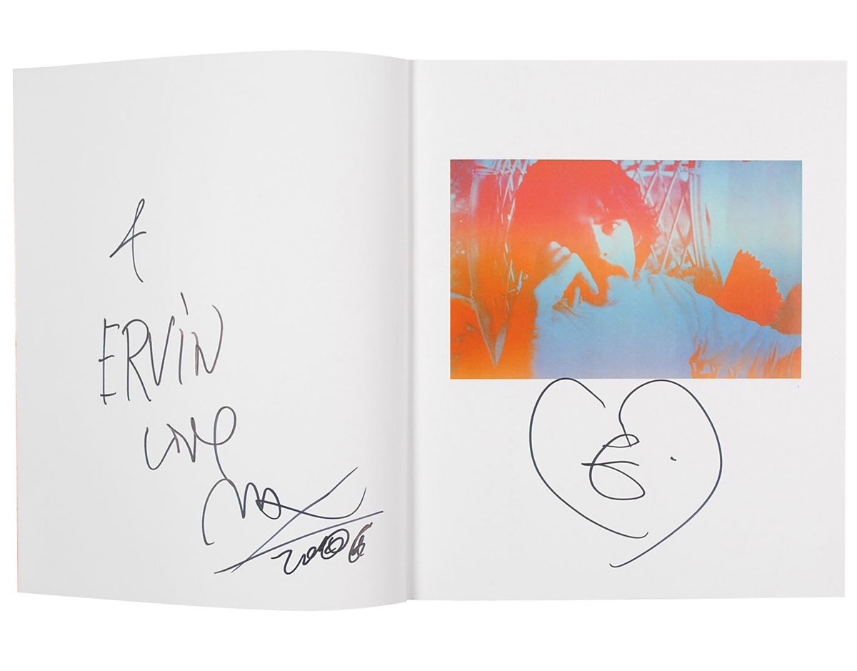 Signed book: The Art of Peter Max. First edition, later printing. NY: Abrams, 2002. Hardcover with dust jacket, 10.25 x 12.25, 240 pages. Signed and inscribed on the reverse of the first free end page, “4 Ervin, Love Max 2006,” with Max sketching a heart on the adjacent page under his printed image. In fine condition. Signature was obtained at a book signing in Ohio on September 15, 2006, and a photocopy of the newspaper announcement for the signing is included.