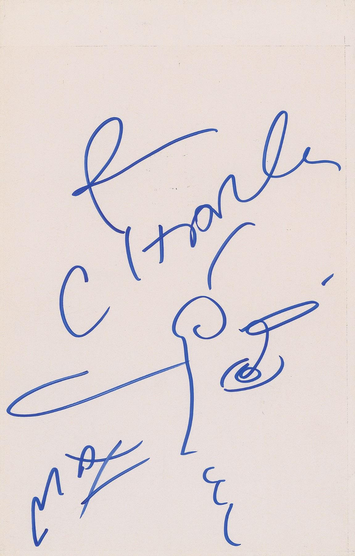 Original sketch of a profile portrait by Peter Max, accomplished in blue felt tip on an off-white 6.75 x 10.5 cardstock sheet, signed and inscribed, "For Charlie, Max." In fine condition.