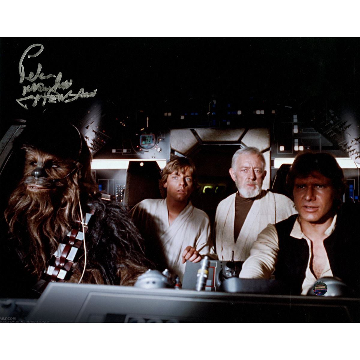 Peter Mayhew Signed 'Chewbacca, Luke Skywalker, Obi Wan Kenobi and Han Solo Millennium Falcon 8x10 Photo