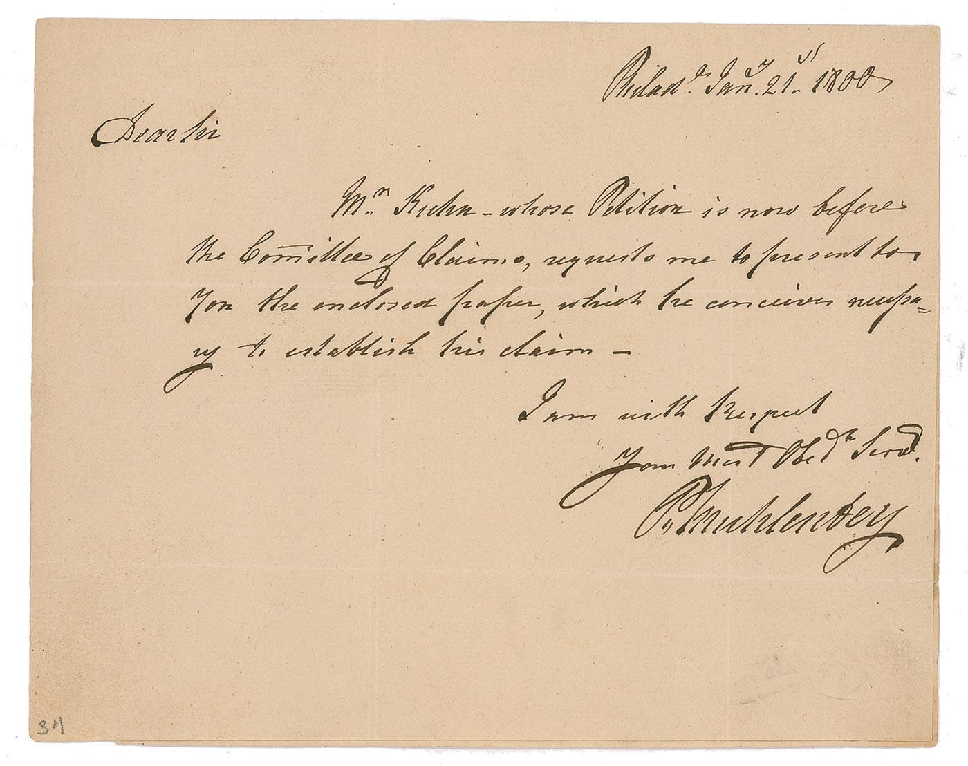 A clergyman and Continental Army officer (1746–1807), Muhlenberg left the ministry in 1776 to command a Virginia regiment. He soon became a brigadier general, and fought Benedict Arnold in Virginia. LS signed “Your most Obed Sevt, P. Muhlenberg,” one page, 8 x 6.5, January 21, 1800. Short letter to the Chairman of the Committee of Claims. In part: “Mr. Kahn whose Petition if before the Committee…requests me to present to you the enclosed paper, which he conceives necessary to establish his claim.” In fine condition, with intersecting folds, one through a single letter of signature, uniform toning, and a bit of mild soiling.