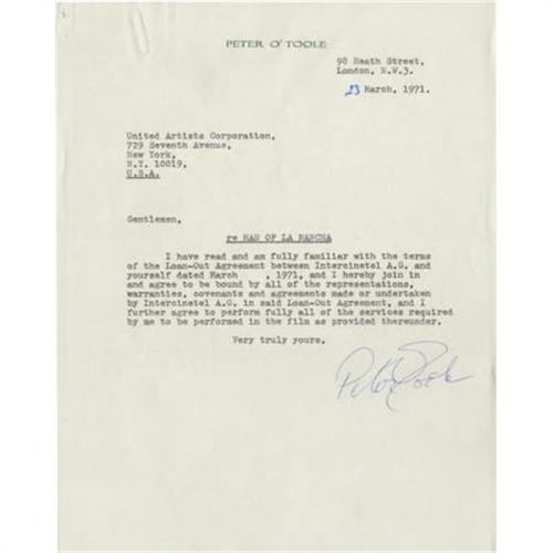 <B>Peter O'Toole Signed Letter Agreement, 1971, Regarding "Man of La Mancha."</B></I> A typed, one-page letter signed by Peter O'Toole in blue ink, dated March 23, 1971. Addressed to United Artists in New York, the letter's subject matter is the 1972 film version of <I>Man of La Mancha,</B></I> and his loan-out to United Artists for the film's production. O'Toole's performance in the film would earn him a Golden Globe nomination in 1973. The letter/agreement is on O'Toole's personal letterhead and his signature is large and clean. In Excellent condition with very mild age-toning and a barely-visible paperclip impression on upper left corner.<BR><BR><b>Shipping:</b> Flat Material, Small (<a target="_blank" href="http://www.heritageauctions.com/common/shipping.php">view shipping information</a>)