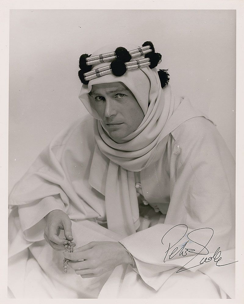 Glossy 8 x 10 photo of O’Toole as he appeared in Lawrence of Arabia, signed in black ink. In fine condition, with a light brush to top of signature and some scattered light creases and surface impressions.