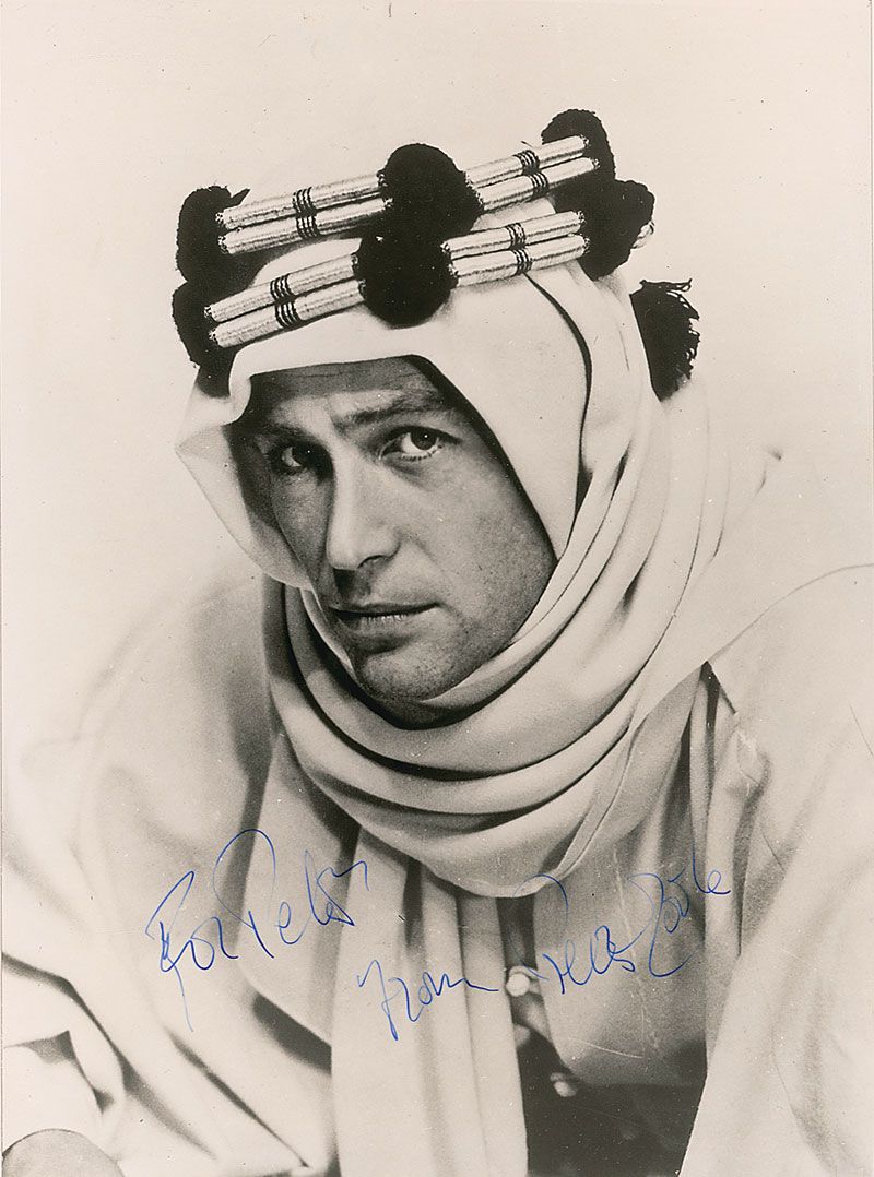 Vintage glossy 7 x 9.5 photo of O’Toole in Lawrence of Arabia, signed and inscribed in person in fountain pen, “For Peter, from Peter O’Toole.” In fine condition.