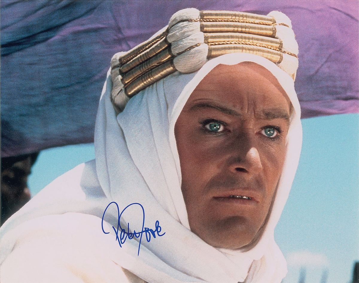 Color satin-finish 14 x 11 close-up photo of O’Toole as T. E. Lawrence from the epic 1962 film Lawrence of Arabia, signed in blue felt tip. In fine condition.