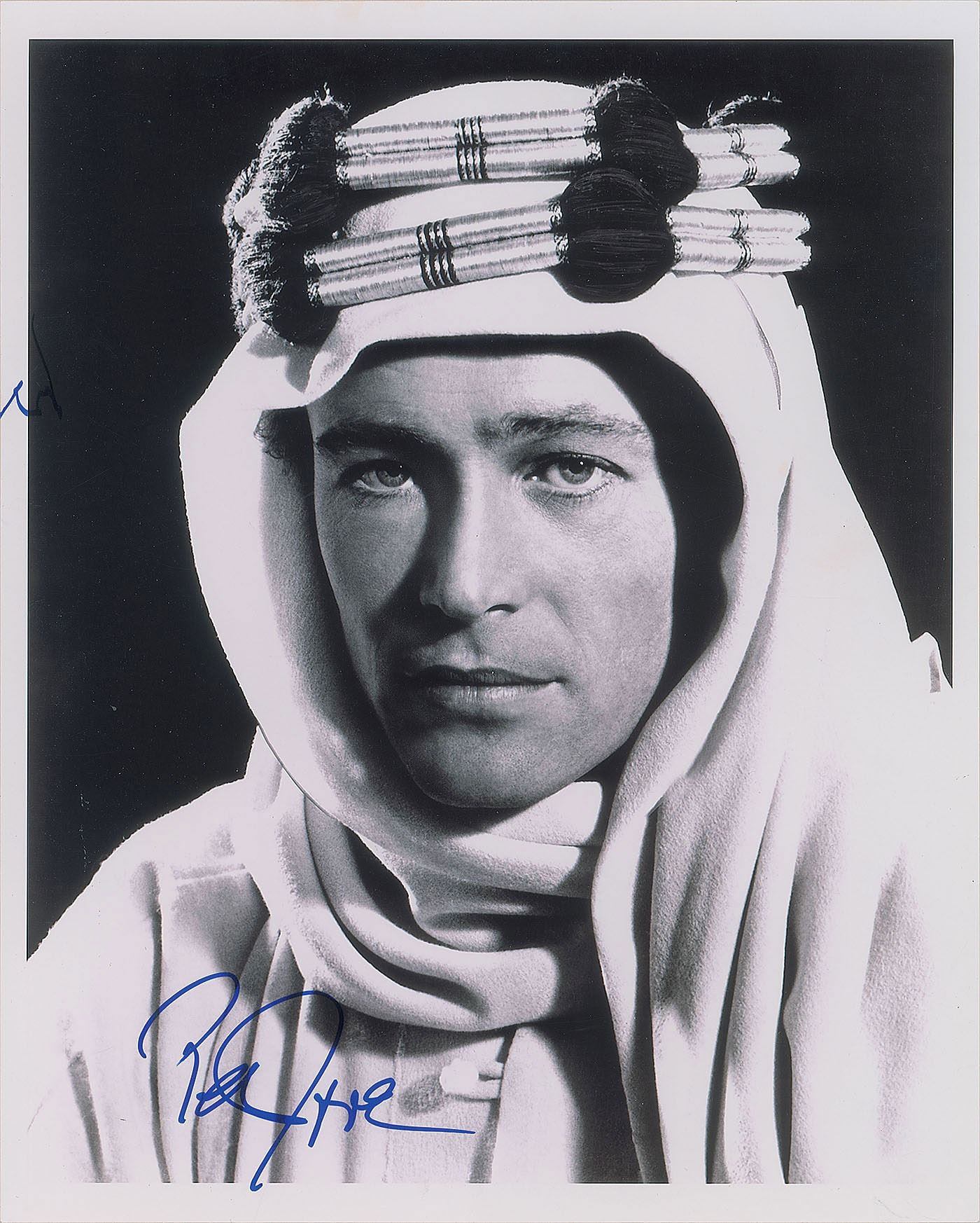 Glossy 12 x 15 close-up photo of O'Toole as T. E. Lawrence from the epic 1962 film Lawrence of Arabia, signed in blue felt tip. In fine condition.