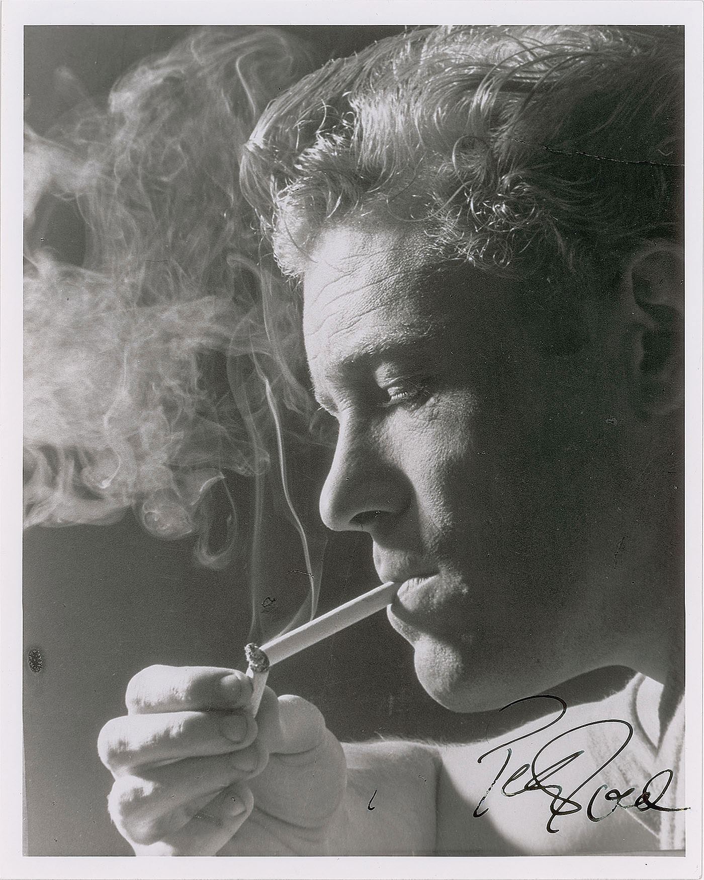 Striking glossy 8 x 10 close-up photo of O'Toole smoking a cigarette, signed in the lower right in fountain pen. In fine condition.