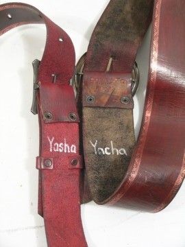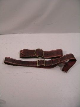 A baldric and belt set that served as wardrobe for 'Peter Pan' (2003), starring Jason Isaacs. The belt and baldric are both made of red leather, with a design embroidered along the edges, and have metallic buckles. The baldric includes a small pouch, designed to hold a sword in place. Comes with a certificate of authenticity.