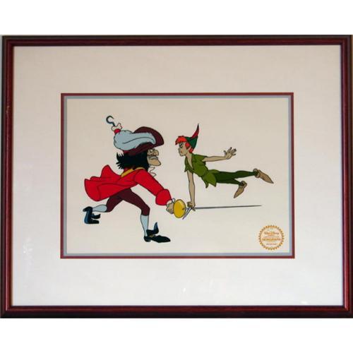 Peter Pan. Limited edition serigraph from the Disney Company of Peter Pan doing battle against Captain Hook. An excellent action scene, copyright 1953. Image size 13" x 9-1/2", triple matted and framed to an overall size of 21" x 17". Certification from The Walt Disney Company affixed to verso.