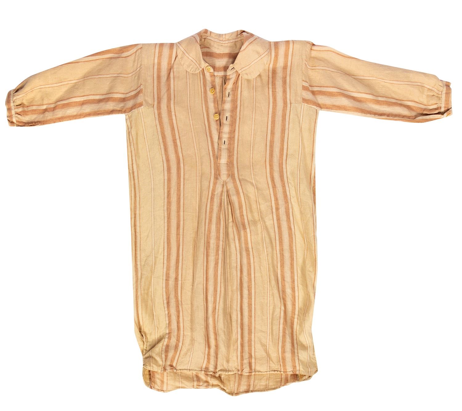 (Universal, 2003) An original costume created for the live action film, Peter Pan. This costume was created for Freddie Popplewell's role as Michael Darling. The costume has "Stage 2" written inside and there is thin wiring in the hem of the garment from its original use. The costume comes with a certificate of authenticity. The costume is in good overall condition, having been intentionally distressed for its original use.