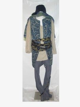 A complete, custom made pirate costume from the set of 'Peter Pan' (2003) starring Jason Isaacs. Costume includes a long sleeve v-neck shirt, an embroidered vest, light cloth pants, a blue and gold sash, a scarf, and a three pointed hat. Comes with a certificate of authenticity.