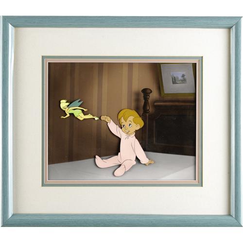 <B>"Peter Pan" Production Cel Original Art (Walt Disney, 1953).</B></I> Michael Darling shoos an annoyed Tinker Bell, in this playful cel from Disney's timeless film, "Peter Pan." The hand inked, and hand painted cel sits in front of a hand-painted presentation background (not an original background from the film). The image of Tinker Bell was trimmed out of the original acetate and mounted onto Michael's cel. The art has an image area of 12" x 9.5", is framed, and in Excellent condition.<BR><BR><b>Shipping:</b> Framed (<a target="_blank" href="http://www.heritageauctions.com/common/shipping.php">view shipping information</a>)