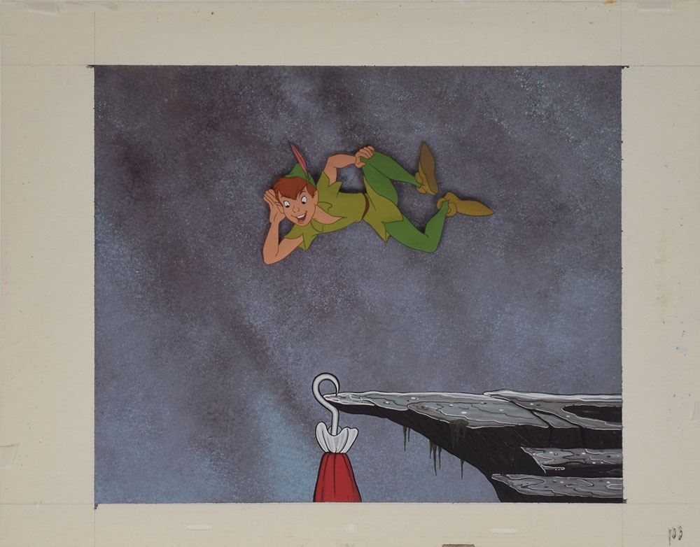 (Walt Disney Studios, 1953) Original production drawing featuring Peter Pan from Peter Pan, showing him taunting his nemesis. The cel is placed on a hand-painted custom prepared background depicting Captain Hook's namesake hand dangling from the edge of a cliff. Character image measures 5.25 x 2.75 and background measures 12 x 10, with overall dimensions of 18 x 14. In fine condition.