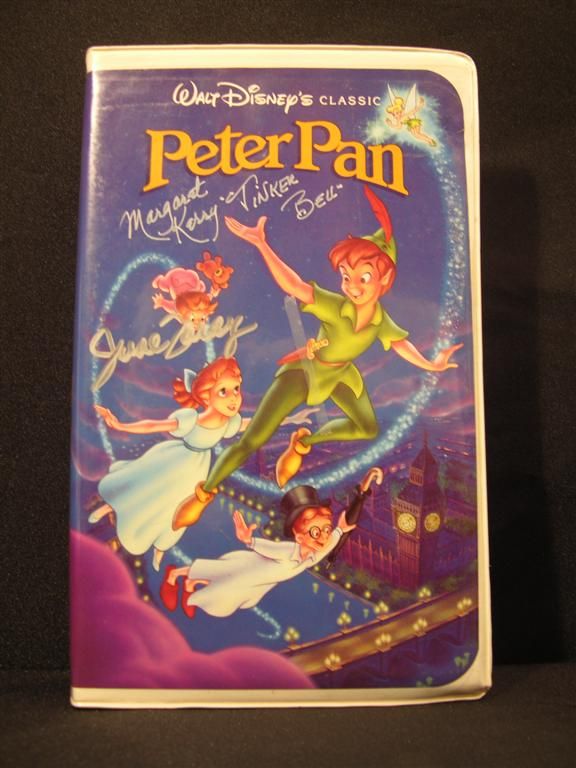 Peter Pan VHS tape signed on the front cover by veteran voice actress June Foray, who plays the Mermaid, and Margaret Kerry, who played Tinkerbell. Kerry has added her character name.