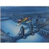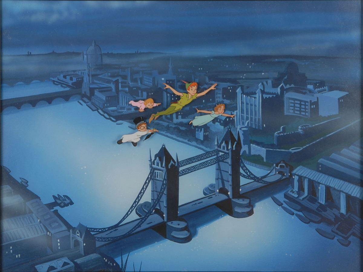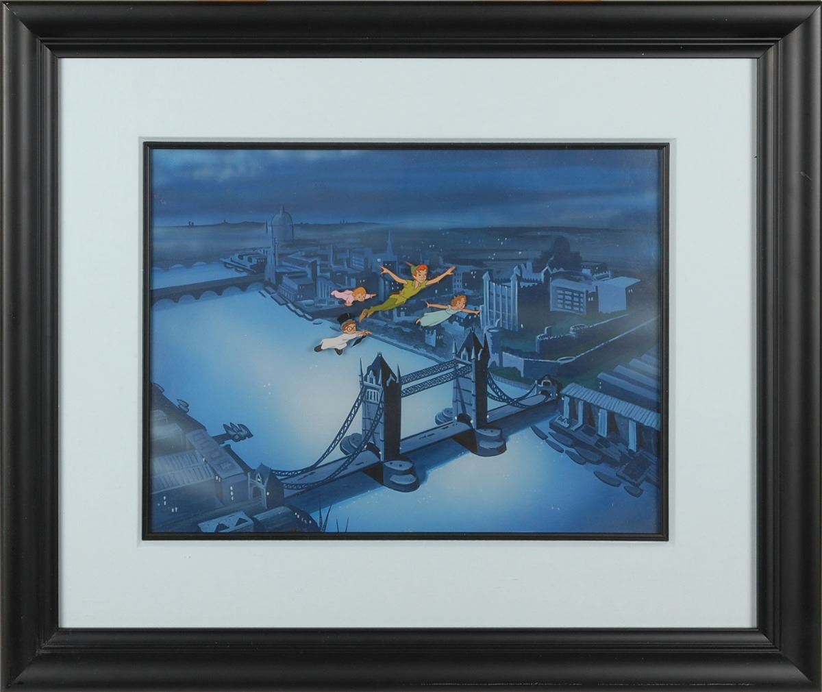 (Walt Disney Studios, 1953) Original production cel featuring Peter Pan, Wendy, John, and Michael from Peter Pan, showing the characters soaring over the city of London. The cels are trimmed to image and placed on a custom prepared background of London based on the film, hand-painted by an ex-Disney artist in the early 2000s. Overall character image measures 5 x 3, with a mat opening of 15.5 x 11.5. Archivally framed to an overall size of 24.5 x 21. In fine condition. A gorgeous set-up from a classic film. Oversized. Please contact RR Auction for a shipping quote.