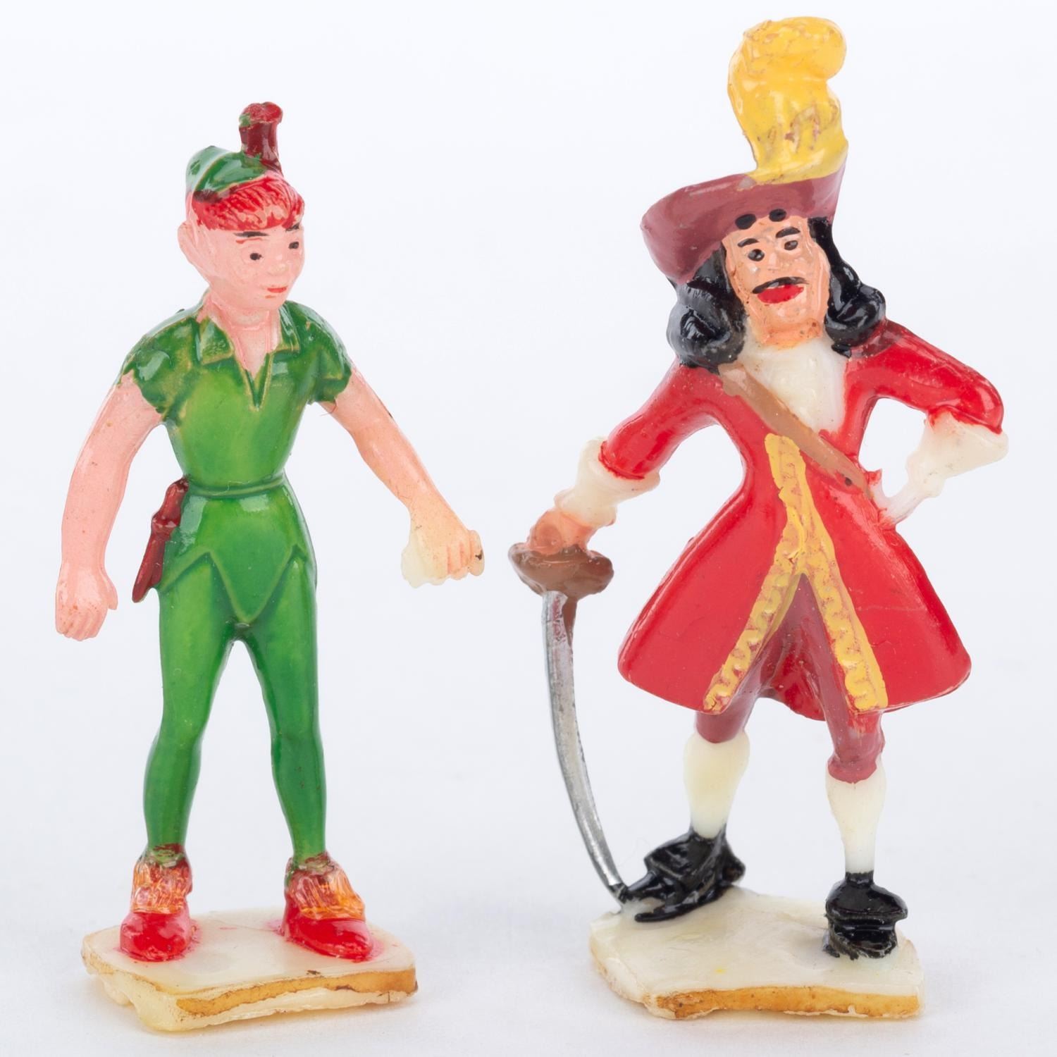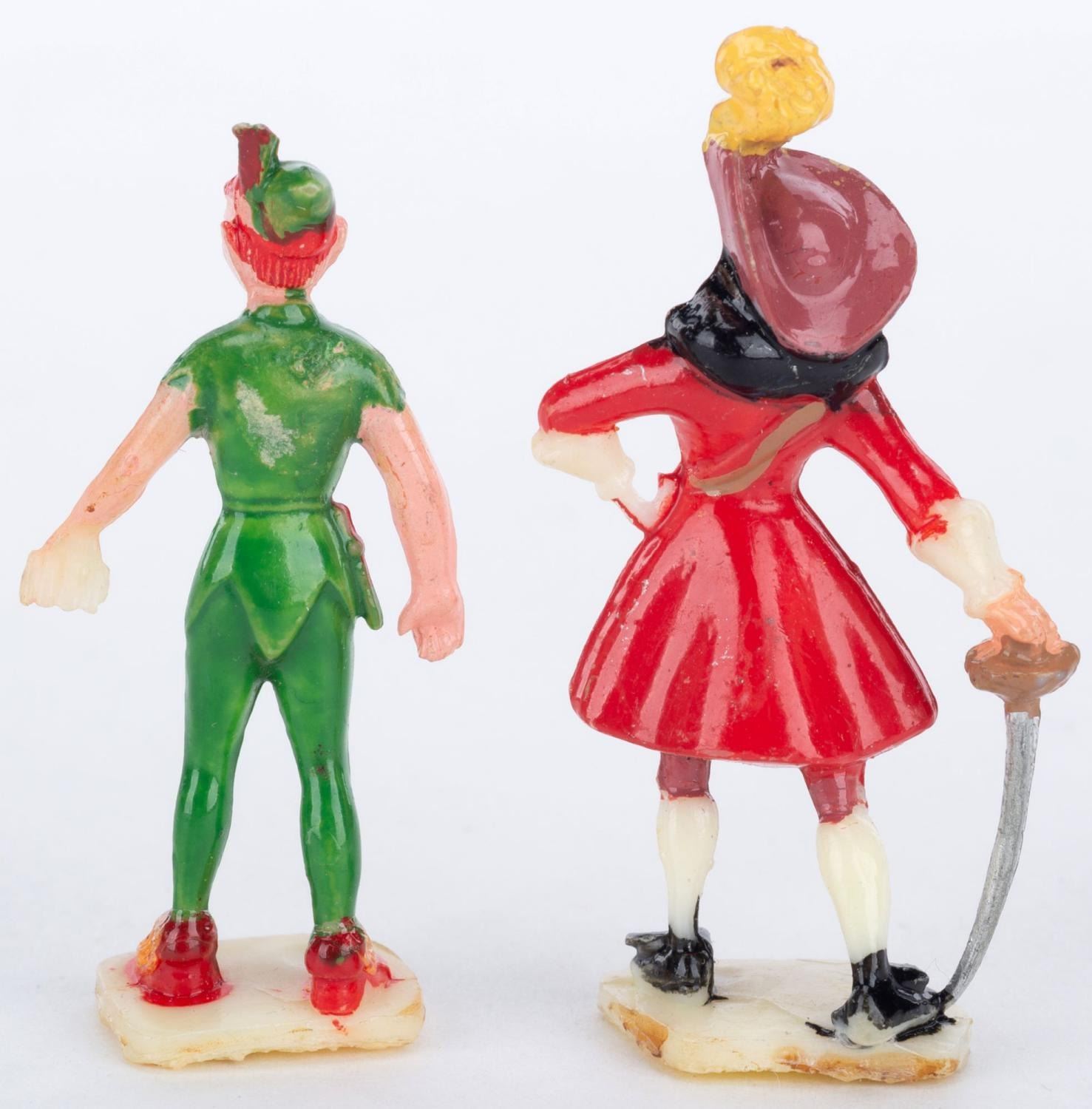 (Marx, 1960s) A pair of original Peter Pan and Captain Hook Disneykins miniature figurines. Manufactured by Marx Toys in the 1960s, the figurines measure approximately 1.5" tall each and are in very good condition with light wear from age and display.
