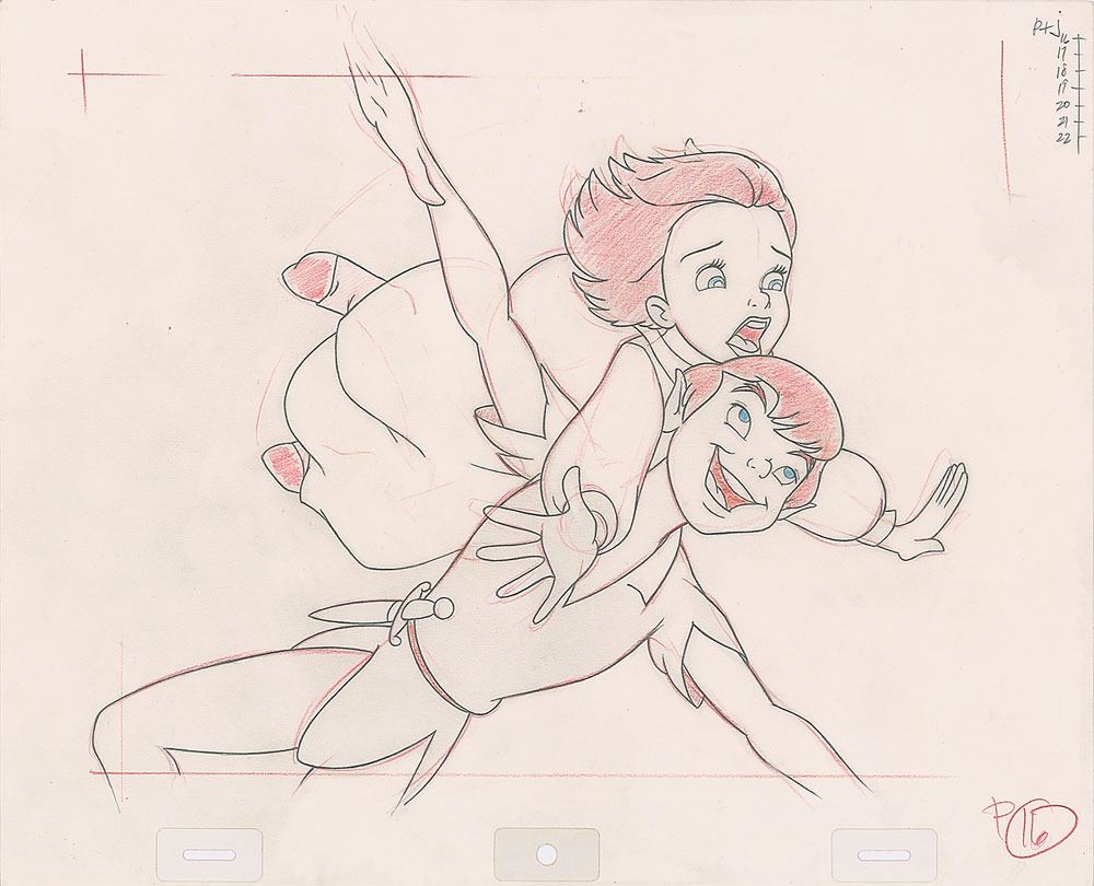 (Walt Disney Studios, 2002) Original production drawing featuring Peter Pan and Jane from Return to Never Land, the 2002 sequel to Disney's classic 1953 film. Accomplished in graphite and colored pencil on 13 x 10.5 animation paper. Overall image measures 10.5 x 8.5. In fine condition.