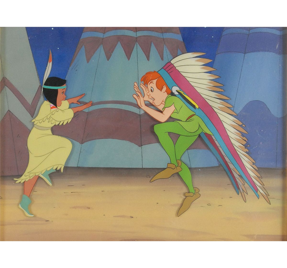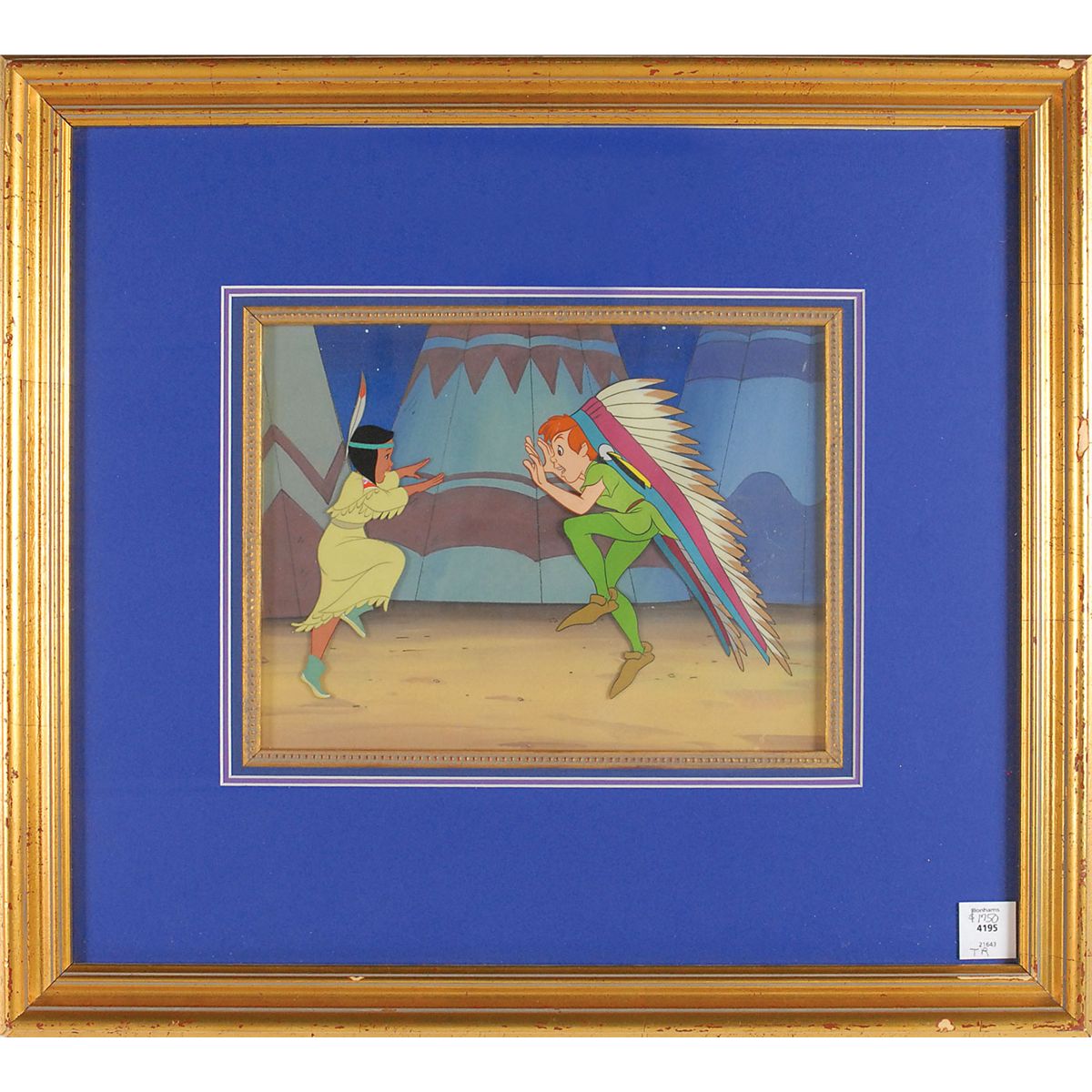 (Walt Disney Studios, 1953) Original production cel featuring Peter Pan and Tiger Lily from Peter Pan, showing them dancing together during the scene where the Indian Chief and his chorus sing the song ‘What Makes the Red Man Red?’ The cel is placed on a matching copy background. Character images measure 5 x 5.5 and 2.5 x 5.75, with a mat opening of 9.75 x 7.5. This piece is also framed to an overall size of 19.25 x 17.25. In fine condition, with a bit of cracking to paint. A nice cel with great images of this pair of important characters.