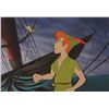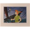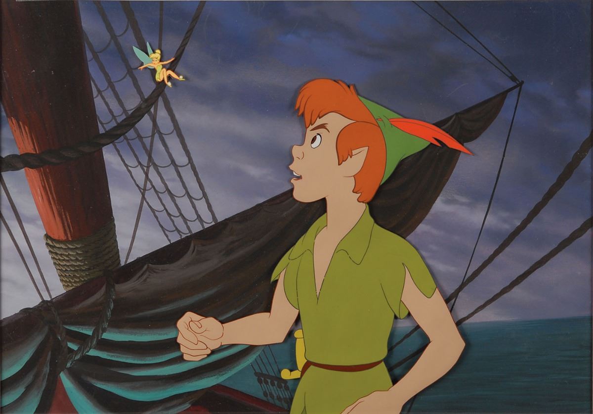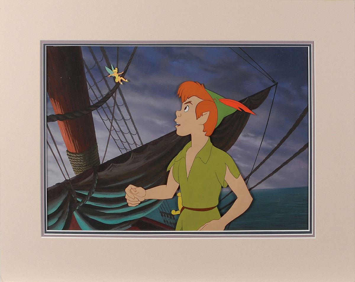 (Walt Disney Studios, 1953) Original production cels and production background featuring Peter Pan and Tinker Bell from Peter Pan, showing the title character staring up at the playful pixie. The cels are trimmed to image and placed on a hand-painted production background of Hook’s ship the Jolly Roger. Character images measure 7 x 8.25 and 1.25 x 1, with a mat opening of 14.5 x 10. Mat dimensions are 19.5 x 15.5. In fine condition. A marvelous set-up from an iconic classic.
