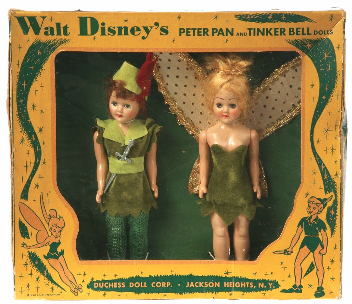 (Duchess Doll Corp., 1953) This beautiful pair of vintage dolls were created by Duchess Doll Corp in 1953 during the theatrical release of Walt Disney's "Peter Pan". The dolls of come complete in their original box. Dolls measure 8" tall in their 9.5"x11"x2.25" box. Dolls are in very good condition and the box has moderate wear.