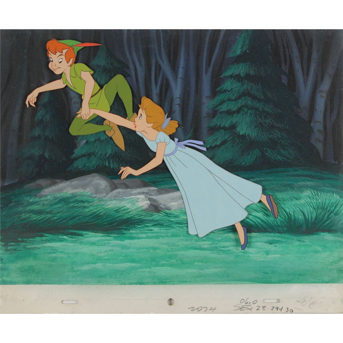 (Walt Disney Studios, 1953) Original production cel and production background setup featuring Peter and Wendy from Peter Pan, showing him holding her hand as they glide through the air. The full 16 x 12.5 cel is placed on a 12 x 10 hand-painted production forest background from the same film. Character image measures 9.25 x 7.25. In fine condition. This is an especially scarce and desirable example as Peter Pan and Wendy are both original to the same full cel, rather than separately trimmed and applied later. Between the superlative hand-painted image of the film’s romantic pairing and beautifully designed background, this is an impressive piece that makes for fantastic display.