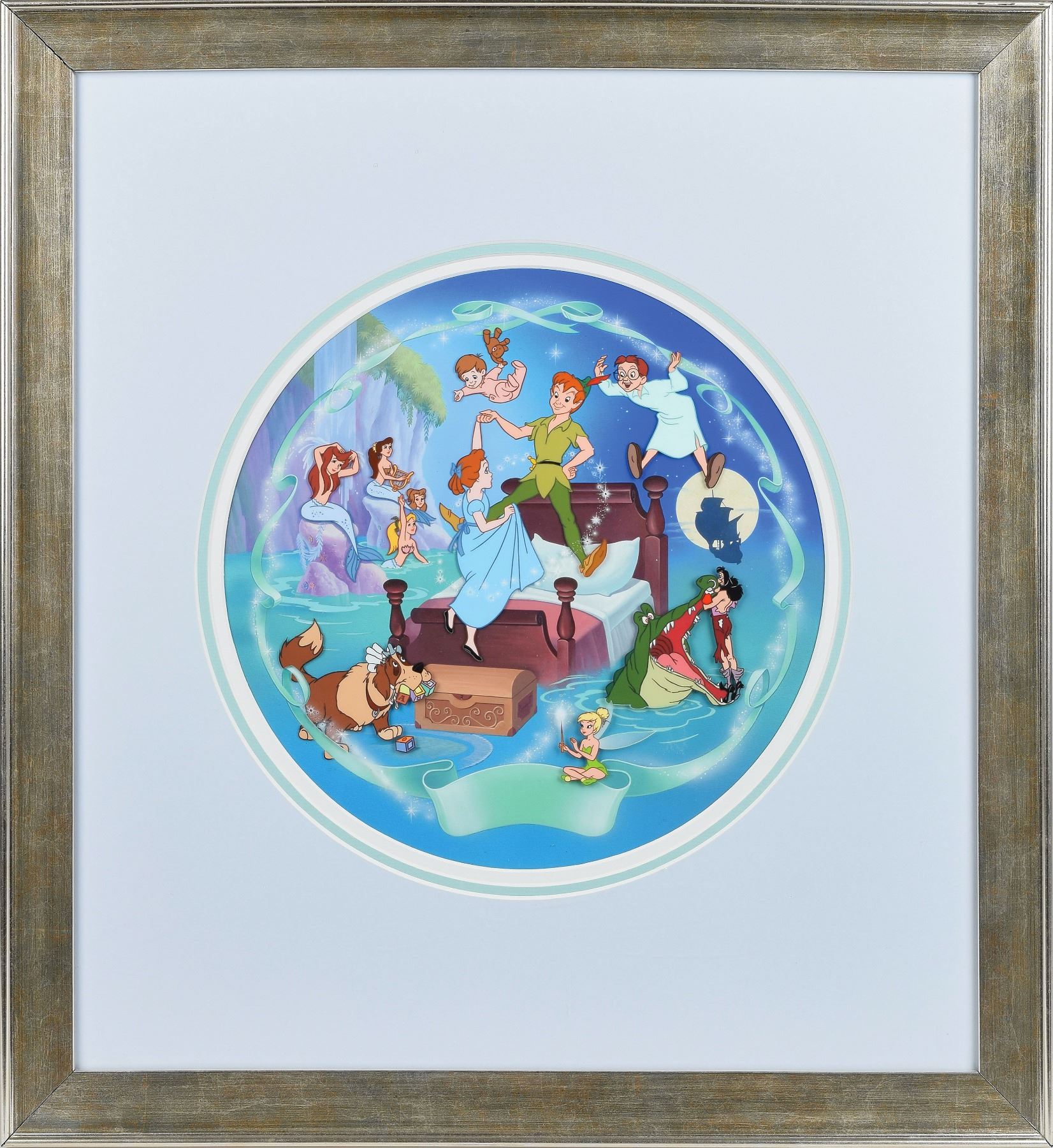 (Walt Disney Studios, 1996) Very rare original production cel and master background set-up featuring several Peter Pan characters for the Disney's Musical Memories collector's plate entitled 'Flight to Neverland.' The design depicts Peter Pan with the three Darling children, Captain Hook battling with the crocodile Tick-Tock, Nana the Newfoundland dog, a quartet of mermaids, and the fairy Tinker Bell. The cel is placed on a fabulous matching hand-painted production background that blends a child's bedroom with the magic of Neverland. Archivally triple-matted and framed to an overall size of 21.75 x 23.75, with a mat opening of 12.5? in diameter. Frame backing features a Disney Collectibles copyright stamp and an Alvin White Studio label identifying the set-up's four main artists: Alvin S. White (designer), Brad Landreth (layout artist), Laureen Burger (pencil artist), and Timothy Barnes (illustrator). In fine condition.