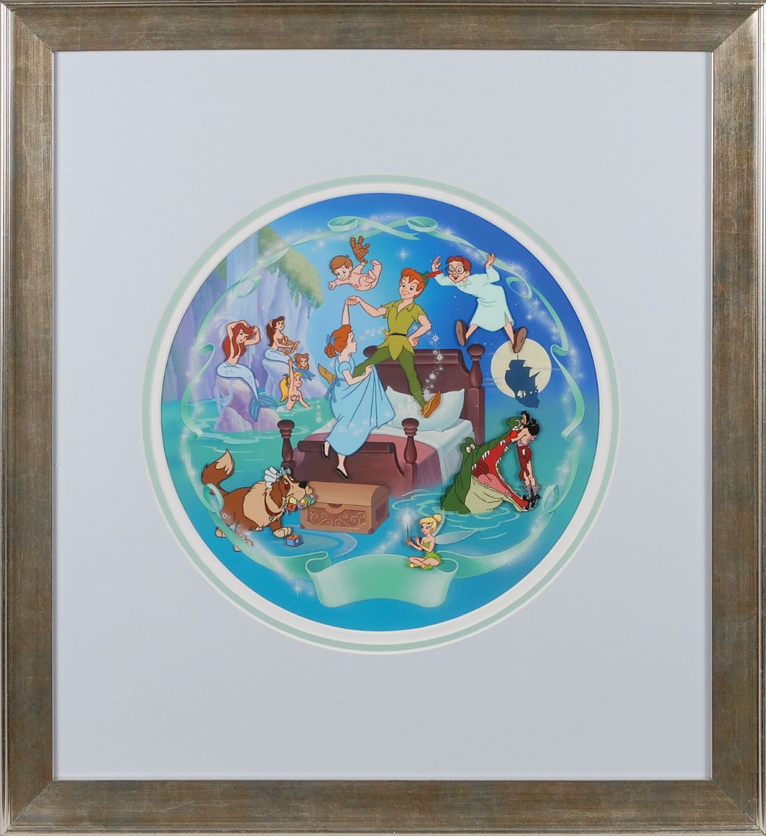 (Walt Disney Studios, 1996) Original keymaster background set-up featuring the cast of characters from Peter Pan, used to make the Bradford Exchange plate ‘Flight to Neverland,’ the fifth plate in the commemorative series ‘Musical Memories.’ The cel is placed on the matching hand-painted production background depicting Pride Rock. Mat opening measures 12? in diameter, framed to an overall size of 21.5 x 24. In fine condition. Oversized. Please contact RR Auction for a shipping quote.