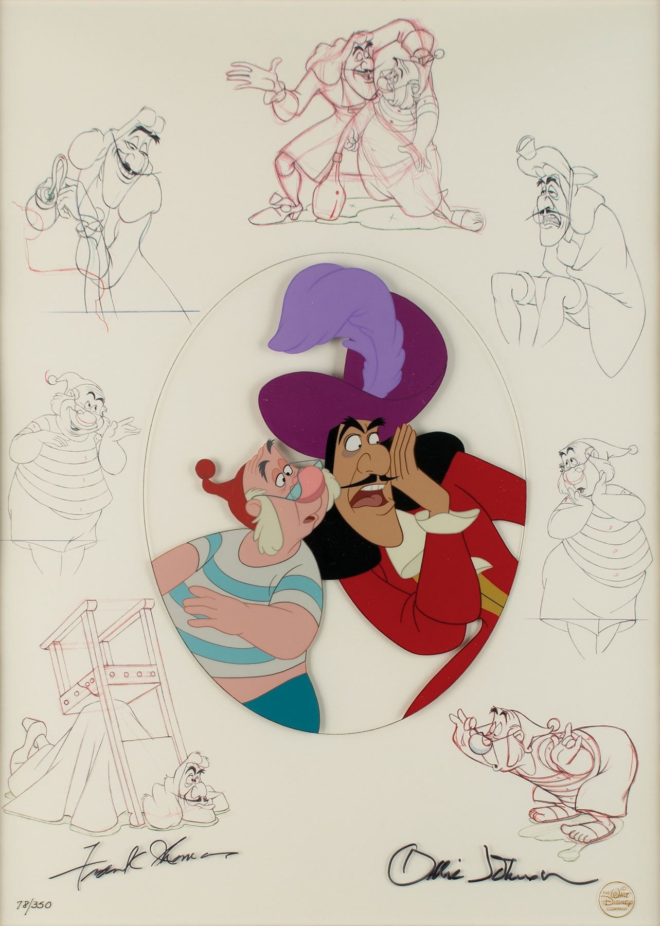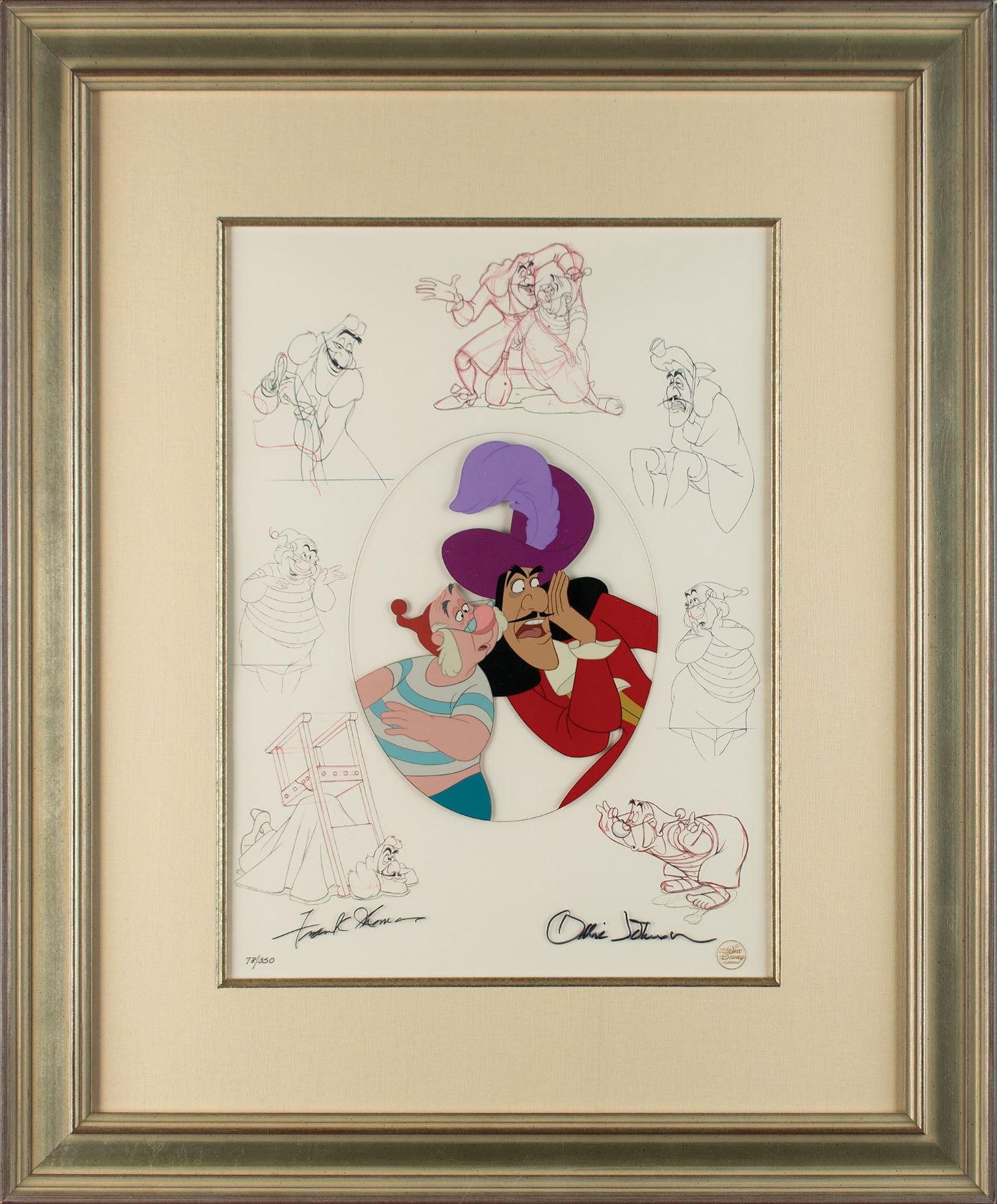 (Walt Disney Studios, 1996) Original limited edition hand-painted cel entitled 'Hook and Smee,' numbered 78/350, showing Captain Hook talking to his sidekick Smee. The cel is placed on its matching Disney litho background, featuring clean-up animation drawings of the Peter Pan pirates. Signed at the bottom in black felt tip by Disney animators Frank Thomas and Ollie Johnson. Image measures 7 x 8.5, with a mat opening of 12.25 x 16.5. Framed to an overall size of 22.5 x 27. The piece has the gold Walt Disney Company seal to lower right. In fine condition. Accompanied by a certificate of authenticity from The Walt Disney Company.