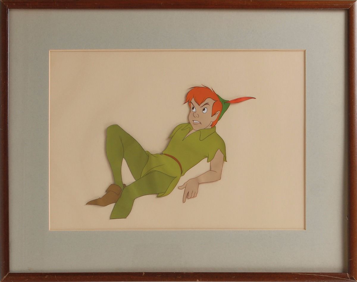 (Walt Disney Studios, 1953) Impressive original production cel from Peter Pan, depicting the titular character during a scene in which Captain Hook has the Neverland hero trapped under his sword. Image measures 9 x 7, with a mat opening of 13.25 x 9.25. This piece is also framed to an overall size of 18.75 x 14.75. In fine condition. A large and beautifully realized pose from Disney’s classic fantasy-adventure film.