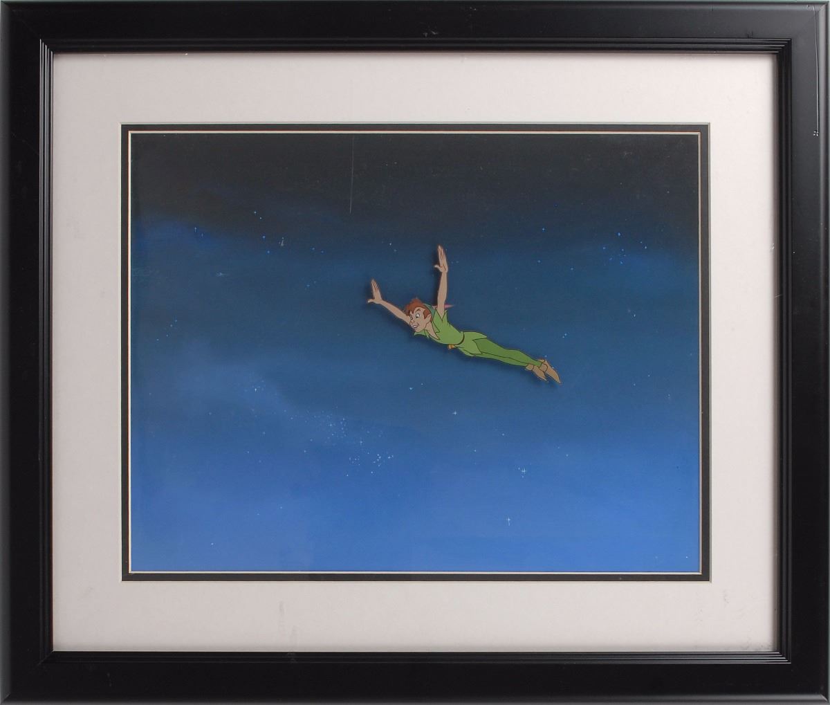 (Walt Disney Studios, 1953) Original production cel from Peter Pan, showing the titular Neverland character soaring across a starry night sky. The cel has been trimmed and applied to a hand-painted sky production background from another Disney film. Pan image measures 5.25 x 3.75, with a mat opening of 15 x 11.5. This piece is also framed to an overall size of 22 x 18.5. In fine condition.
