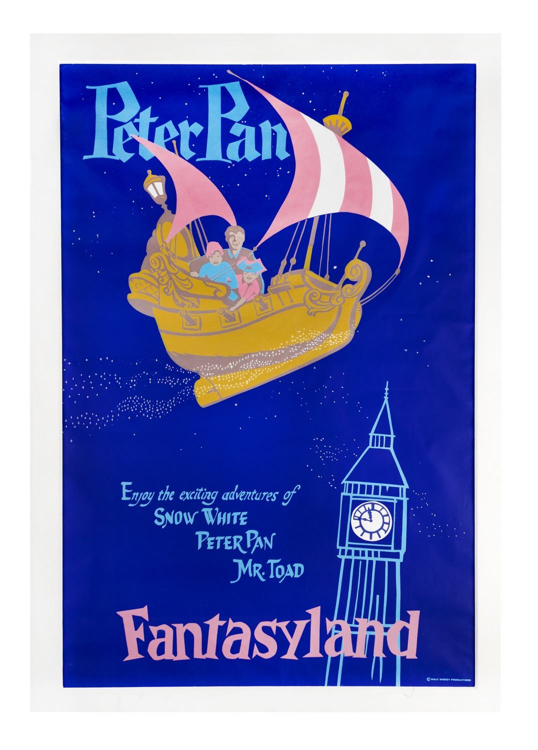 (Disneyland, 1956) An original hand-silkscreened poster for the "Peter Pan's Flight" attraction. The 54"x36" poster, designed by Bjorn Aronson, is extremely popular for its colors and design. The condition is very good with some small tears and minor creasing along the edges. There is some tape along the edges of the back side of the poster from a previous framing.