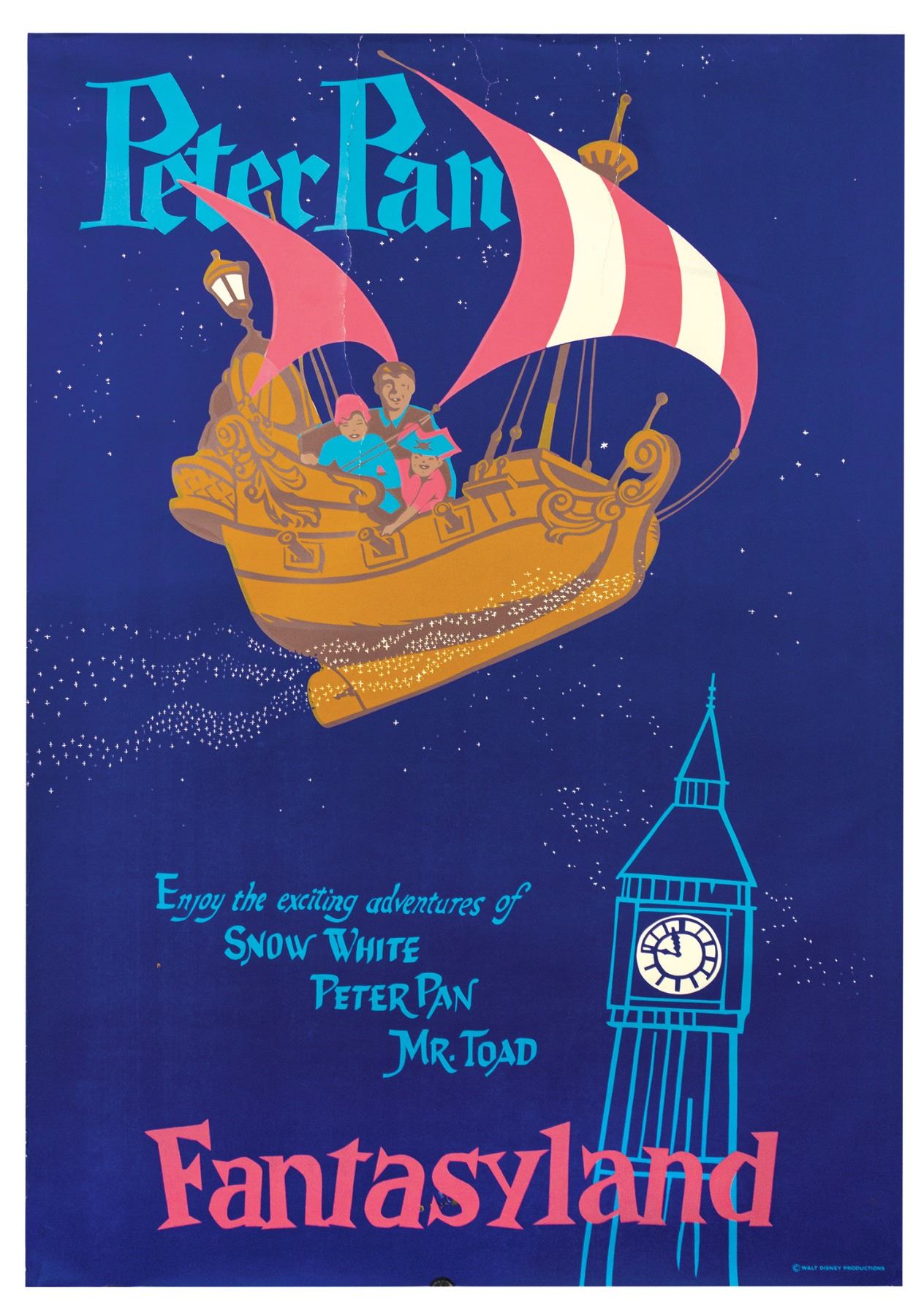 (Disneyland, c.1956) An original hand-silkscreened attraction poster for Peter Pan's Flight. This poster, designed by Bjorn Aronson, beautifully captures the flight over London that has enchanted guests for over 60 years. The poster measures 54"x36" and the condition is poor to fair with two large tears down the top-edge that have been reinforced on the reverse with tape. There are several creases and spots of wear around the edges, and a few small spots of silkscreen color between the A and S in "Fantasyland".