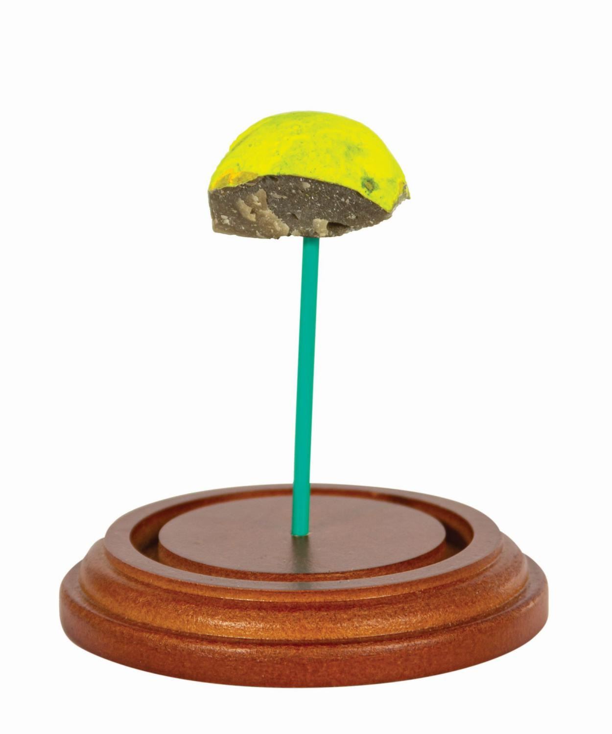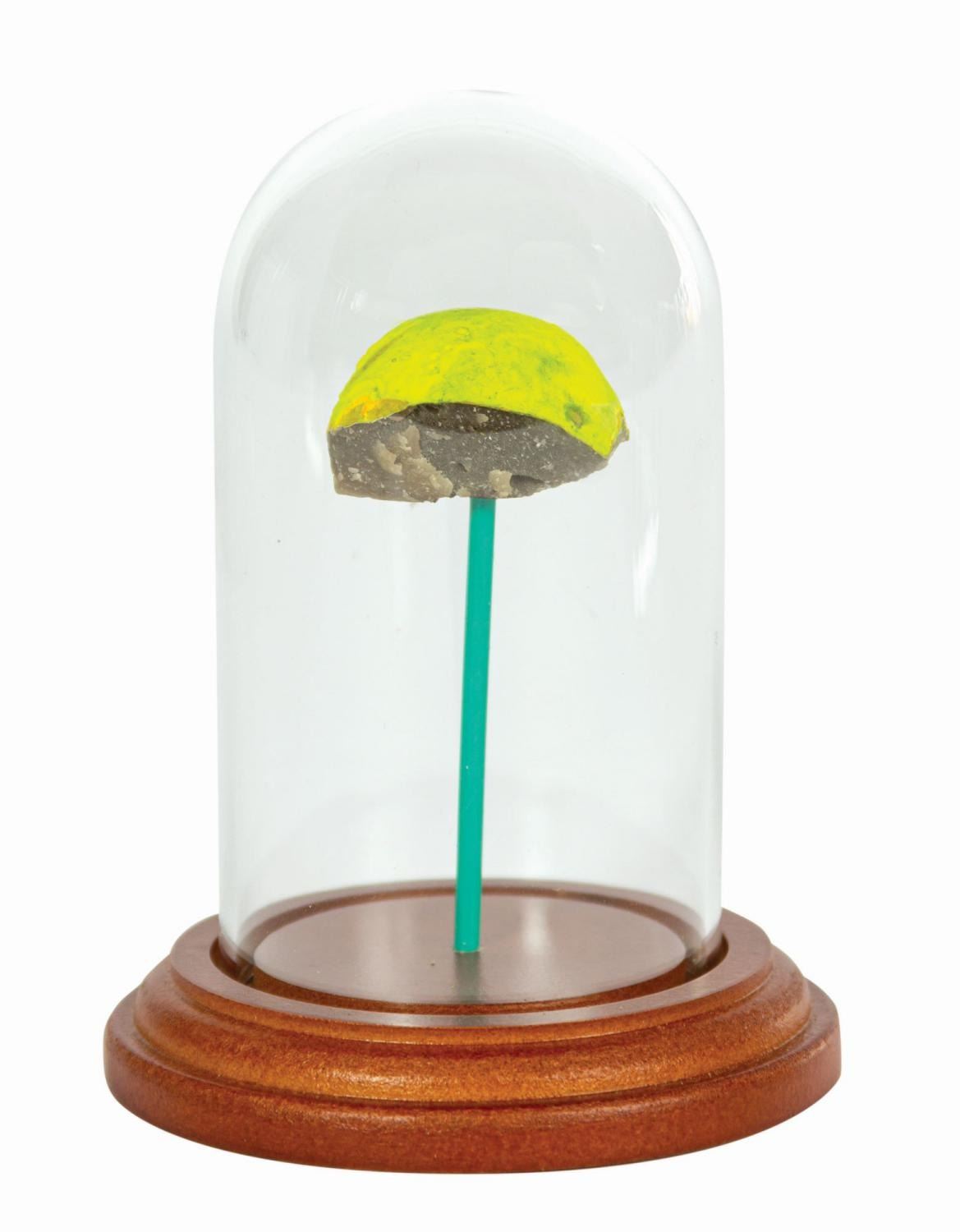 (Disneyland, c.1980s) A park-used star prop from Peter Pan's Flight. The prop is finished with a fluorescent yellow paint which luminesces under the ultraviolet light used in the attraction. These star props are seen in the ride's Neverland volcano vignette. The piece is presented in a custom case. The prop measures 1.25"x1" and 0.75" deep and is in good condition with some chipping to the fluorescent paint. The case is 4"x2.75" in diameter and exhibits minimal wear.