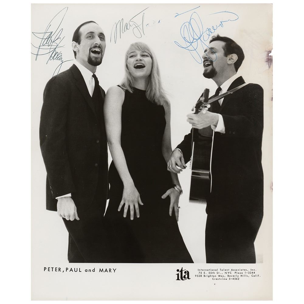 Vintage glossy 8 x 10 agency photo of Peter, Paul, and Mary, signed in ballpoint by Peter Yarrow, Paul Stookey, and Mary Travers. In very good to fine condition, with stains and emulsion loss to the right edge, and pen trouble rendering Travers' last mostly missing.