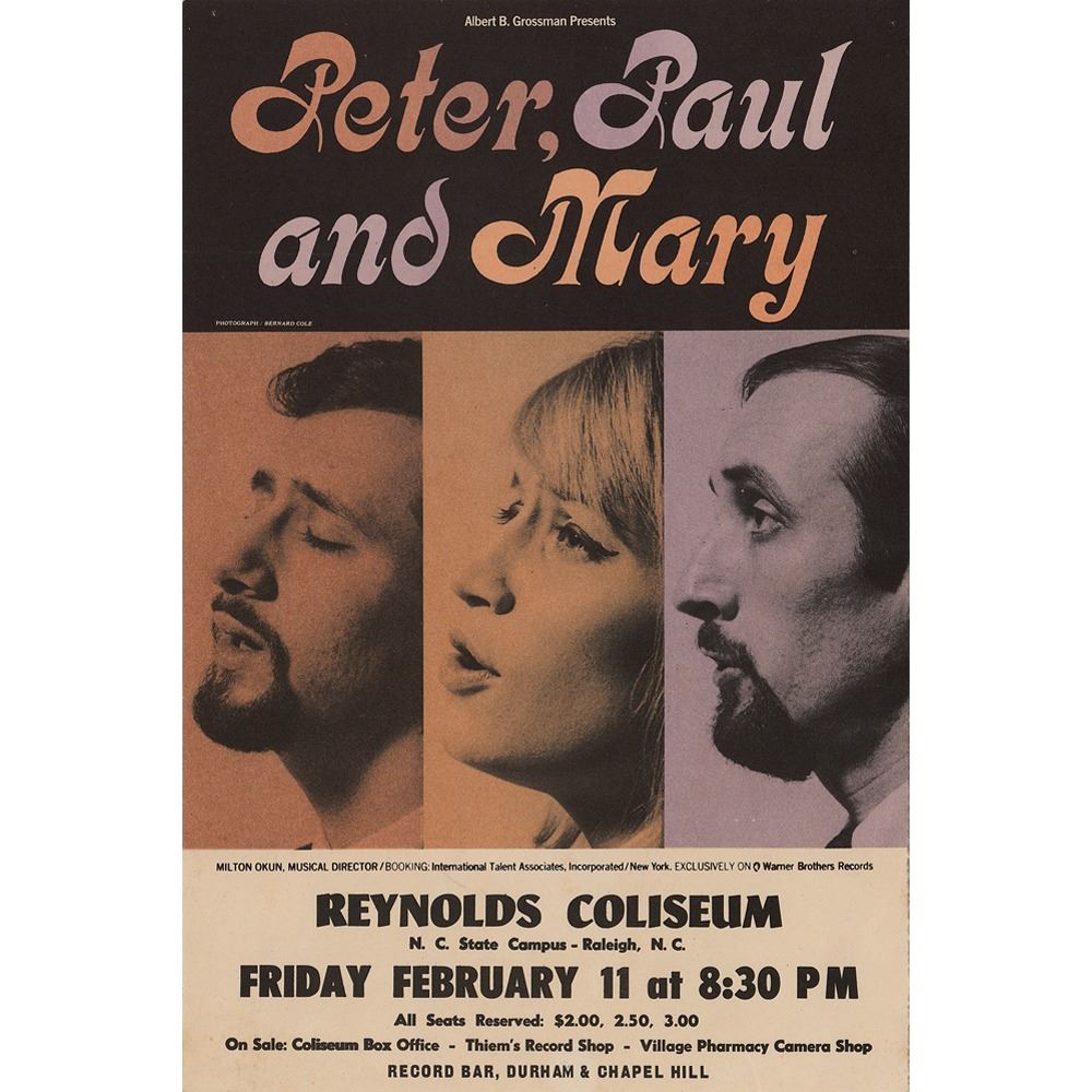 Glossy 10 x 8 Warner Bros. publicity photo of Peter, Paul, & Mary for their 1995 album LifeLines, signed in black felt tip by Peter Yarrow, Paul Stookey, and Mary Travers. In very fine condition. Accompanied by a full letter of authenticity from Beckett Authentication Services, and by a handbill for a Peter, Paul and Mary concert at the Reynolds Coliseum on February 11 [1964].
