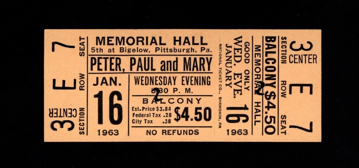 Minty 1961 unused ticket for a performance by folk stars Peter, Paul and Mary, at Memorial Hall, Pittsburgh, PA, January 1963. Ticket measures 1 1/2 x 3 1/2 and is in superb NR.MT-MT condition.