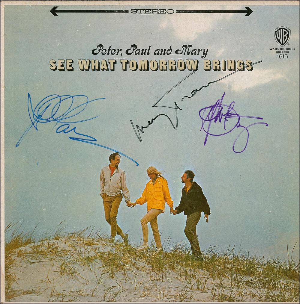 See What Tomorrow Brings album signed in various color felt tip by Peter Yarrow, Noel Stuckey, and Mary Travers. A few creases, scattered soiling, and staining at the lower left corner (heavier on the reverse), otherwise fine condition. The record is not included.