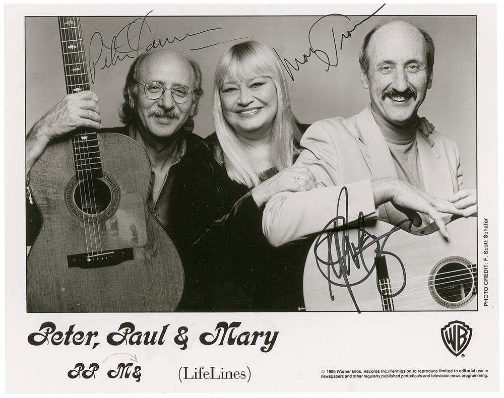 Satin-finish 10 x 8 photo Warner Bros. Records publicity photo, signed in black felt tip by Peter Yarrow, Paul Noel Stookey, and Mary Travers. In fine condition with a paperclip impression to top right.