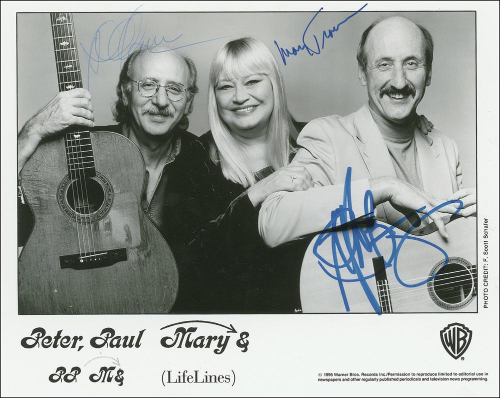 Satin-finish 10 x 8 Warner Bros. publicity photo, signed in blue ballpoint by Peter Yarrow and blue felt tip by Noel Paul Stookey and Mary Travers. In fine condition.