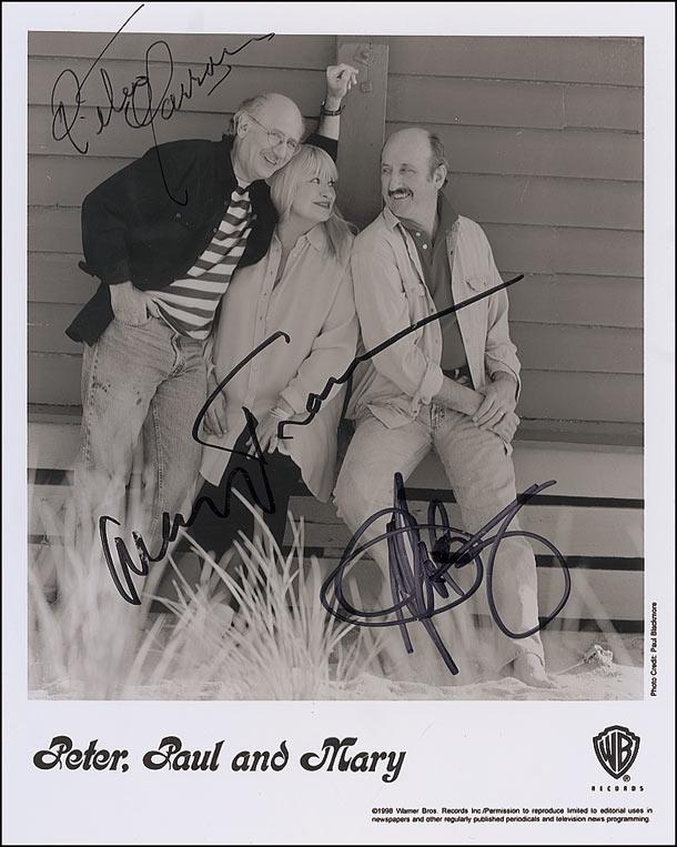 Glossy 8 x 10 Warner Bros. Records publicity photo, signed in black felt tip by by Peter Yarrow, Paul ‘Noel’ Stookey, and Mary Travers. In fine condition, with a few scattered surface creases.